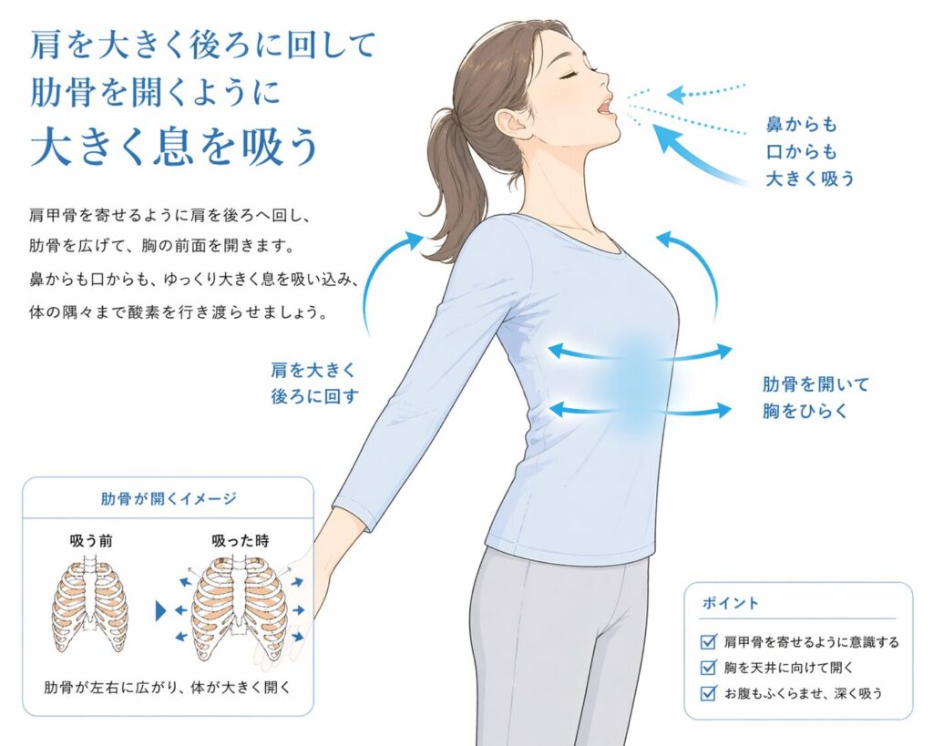 肋骨が大きく開くイメージで、ゆっくり吸う。